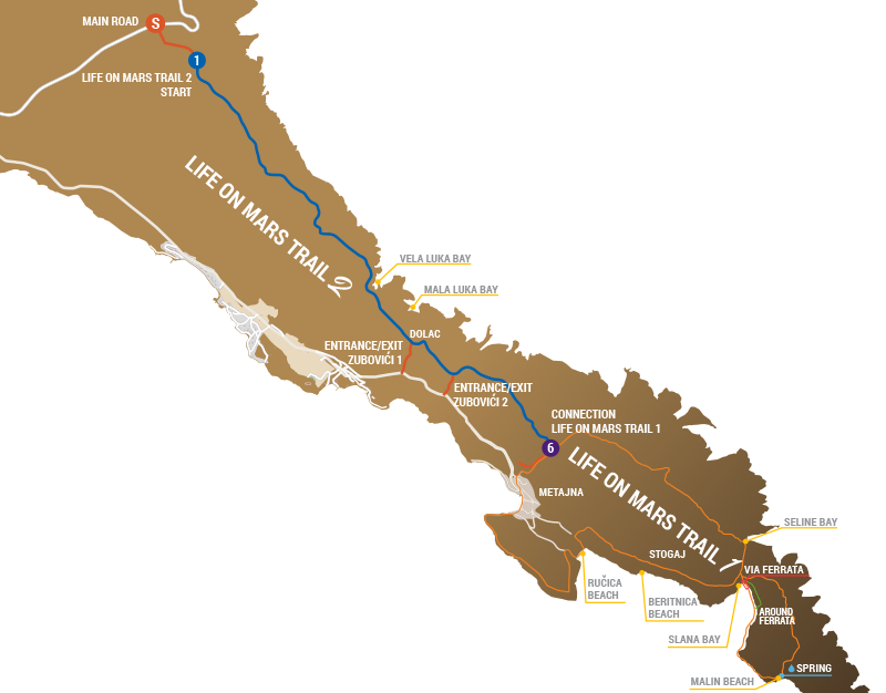 - Der Life on Mars Trail 2 ist kein Rundweg. Da der Startpunkt oberhalb des Fährhafens Žigljen liegt und das Ziel im Dorf Metajna (Fußballplatz), wird allen Besuchern, die ihr Fahrzeug am Start abstellen, geraten, vorher die Rückkehrmöglichkeiten zu prüfen.