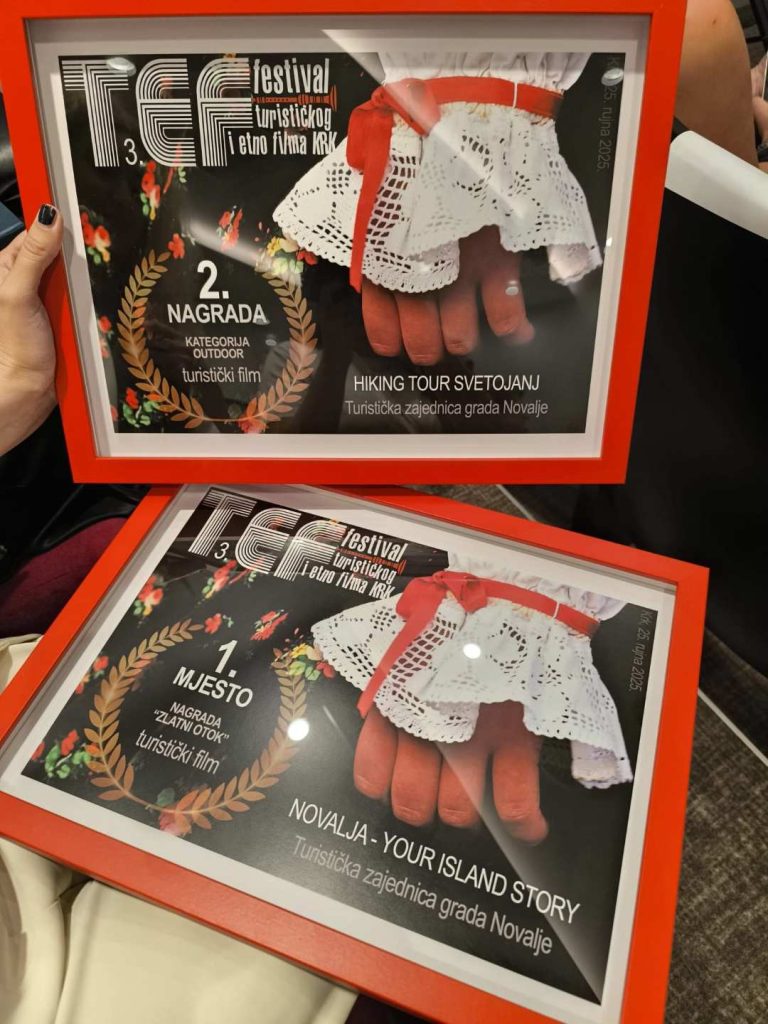The Tourist Board of the City of Novalja won two prestigious awards at this year’s TEF Festival of Tourism and Ethnographic Film, held on September 25–26 in the city of Krk. The third edition of the festival confirmed its international character, presenting a selection of domestic and European films that promote tourism, cultural heritage, and the identity of destinations. The festival program included screenings, panels, and educational content, all culminating in a formal awards ceremony.
