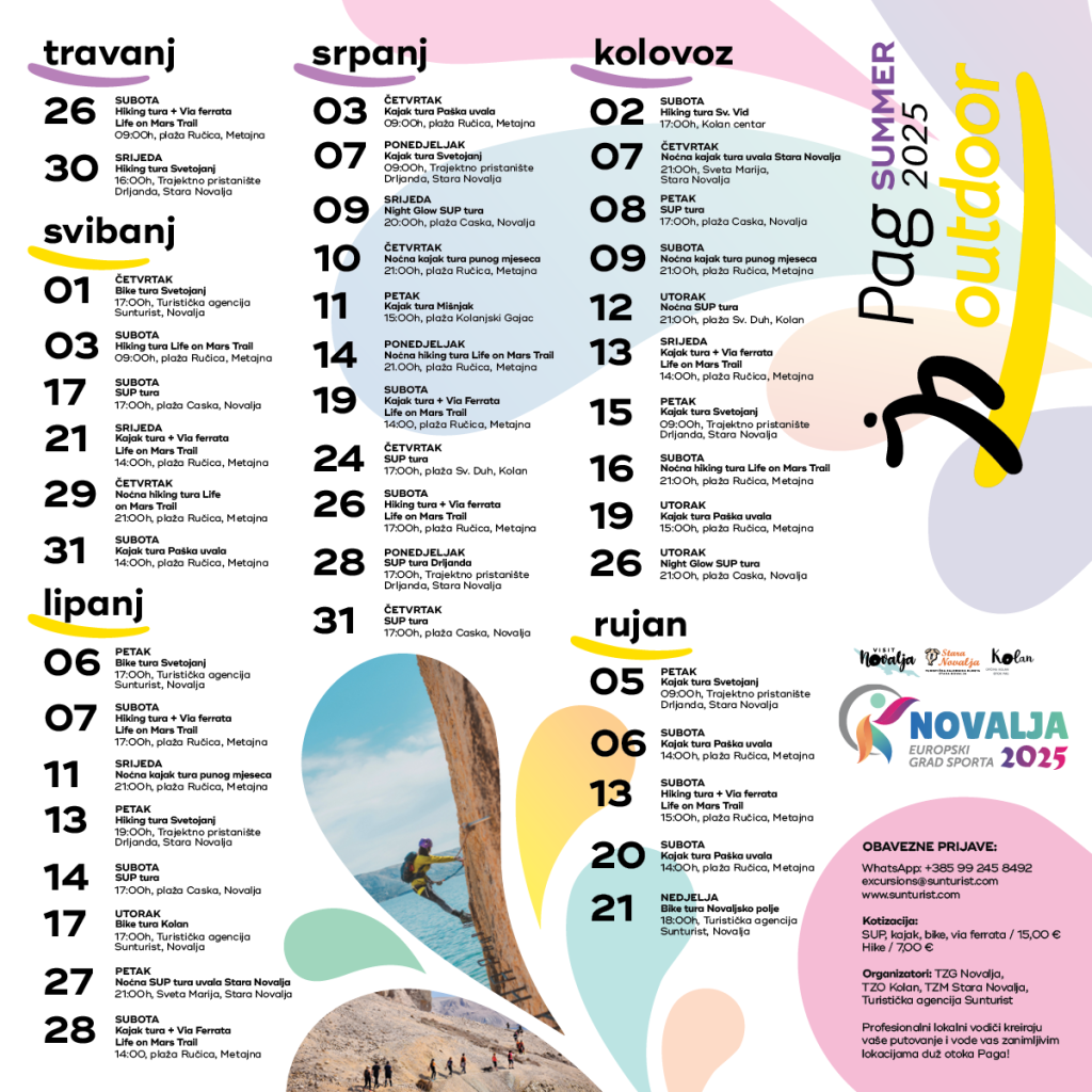 Prijave za aktivnosti obavezne su putem WhatsAppa na broj +385 99 245 8492 ili putem e-maila excursions@sunturist.com. Organizatori projekta su TZG Novalja, TZO Kolan, TZM Stara Novalja i Turistička agencija Sunturist Novalja.